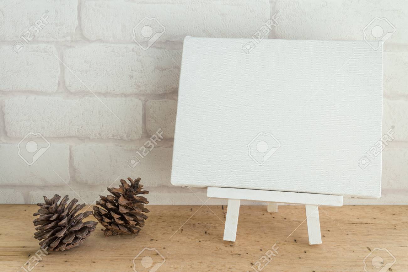 Blank White Wooden Easel Blank Canvas And Pine On Wooden Table