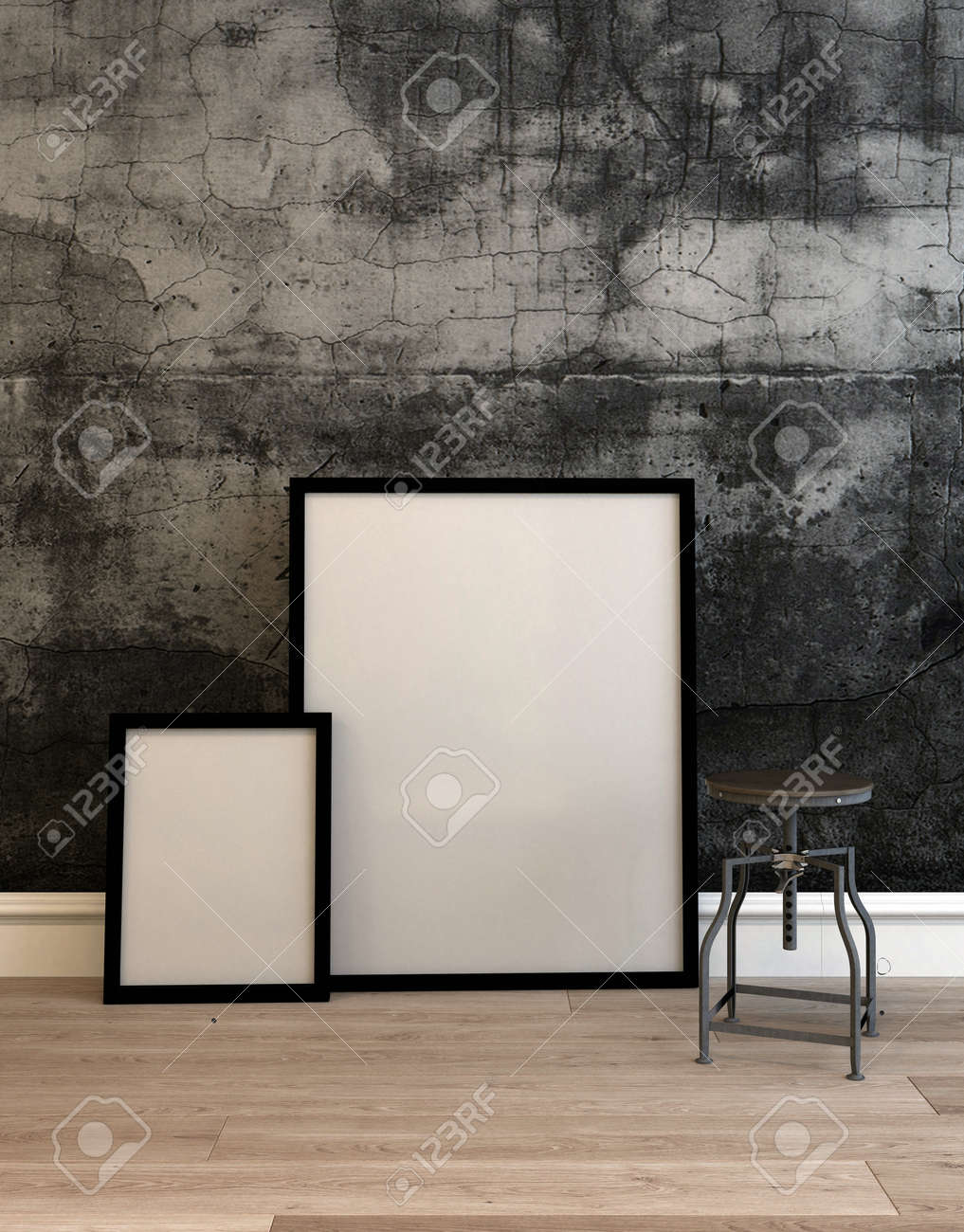 Two Picture Frames With Blank Canvases Leaning Against A Dark