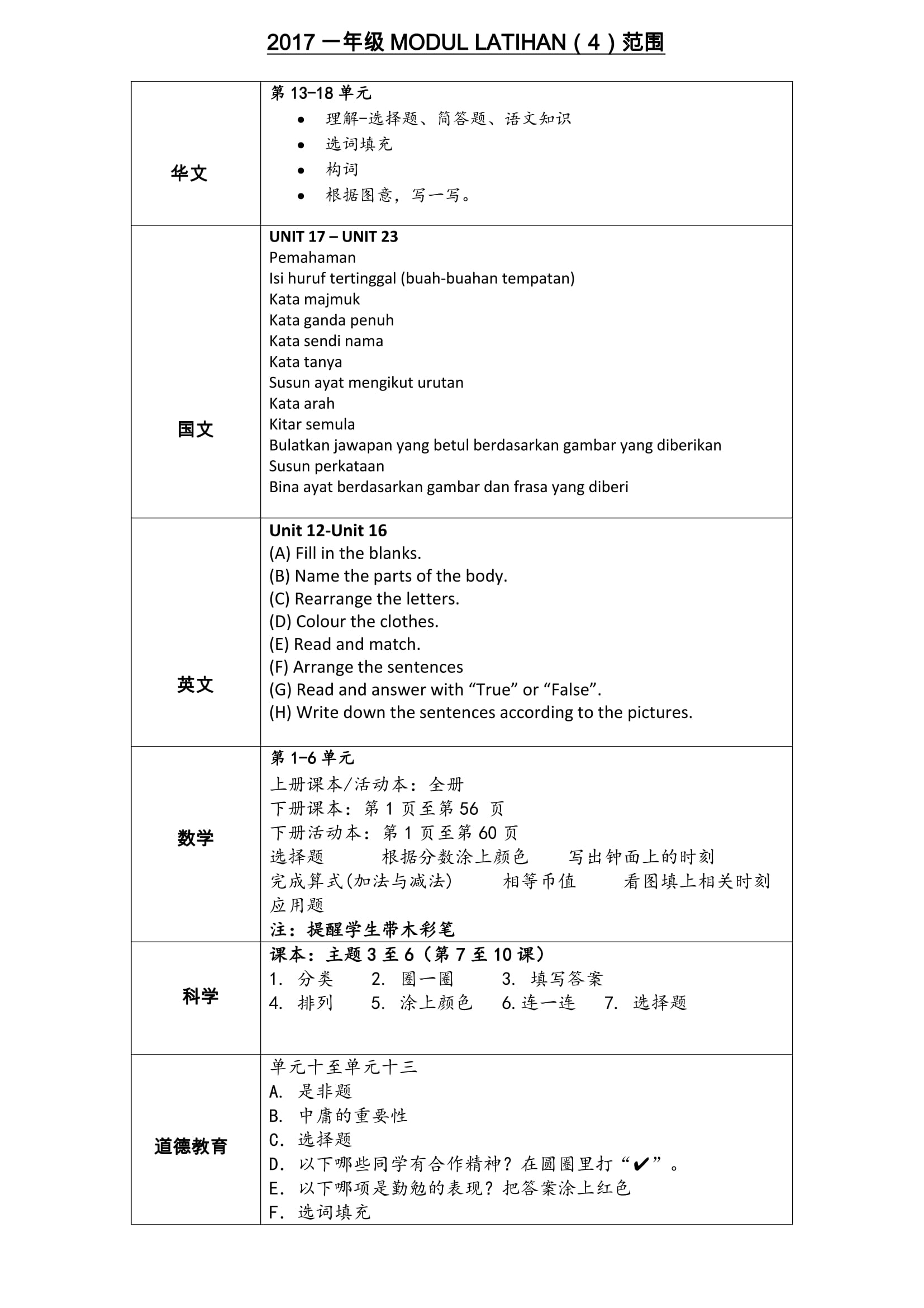 吉隆坡崇文国民型华文小学 2017年一至五年级pksr2考试范围