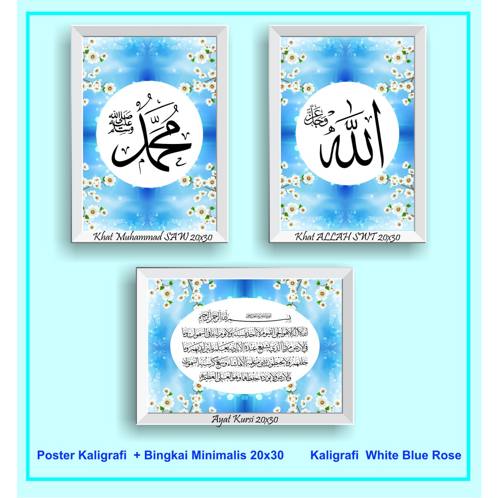 Hiasan Dinding Kaligrafi Shabby Allah Muhammad Saw Ayat Kursi A4 White Blue Rose Frame Fiber Sk0002