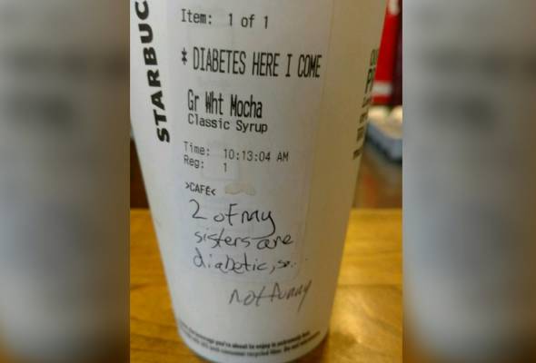 Pelanggan Starbucks Dapat Mesej Pada Cawan Diabetes Aku