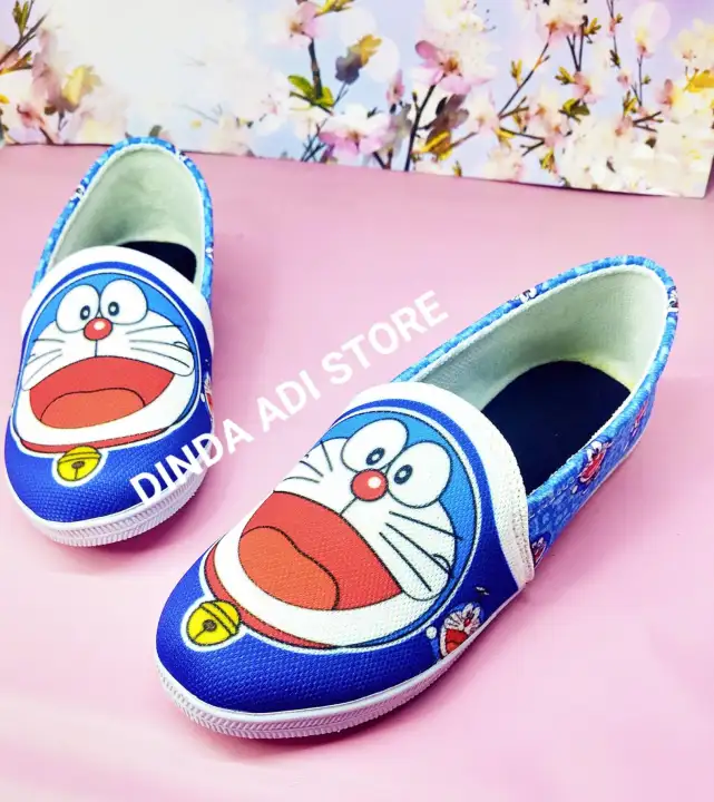 Dinda Sepatu Wanita Lukis Slip On Doraemon Best Seller Trendy Biru Dan Putih