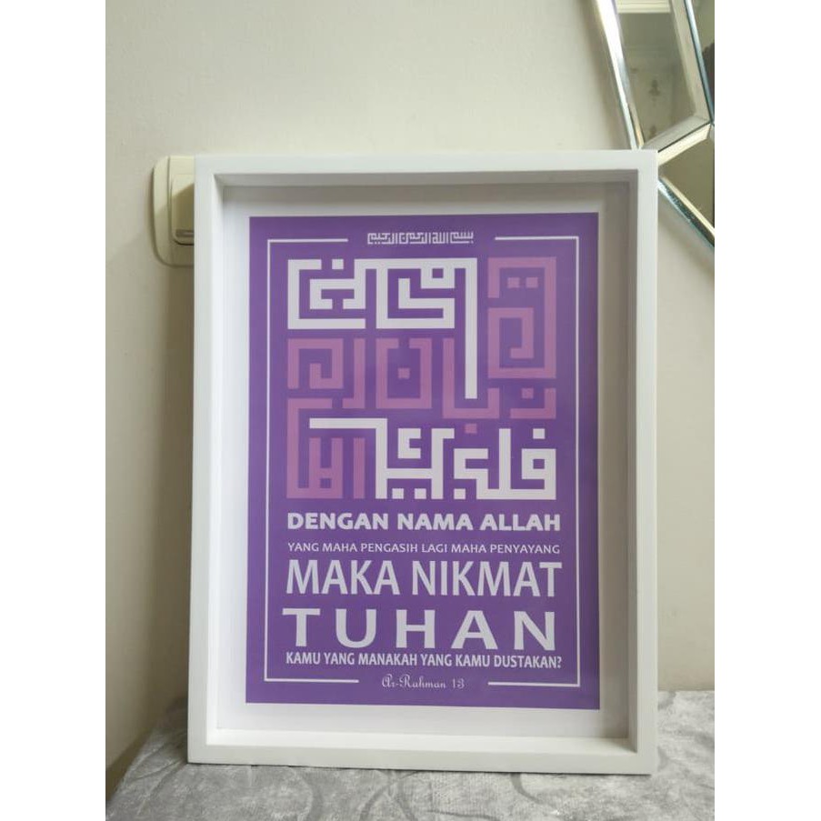 Kaligrafi Kufi Surat Ar Rahman Ayat 13 Warna Ungu Frame Kayu