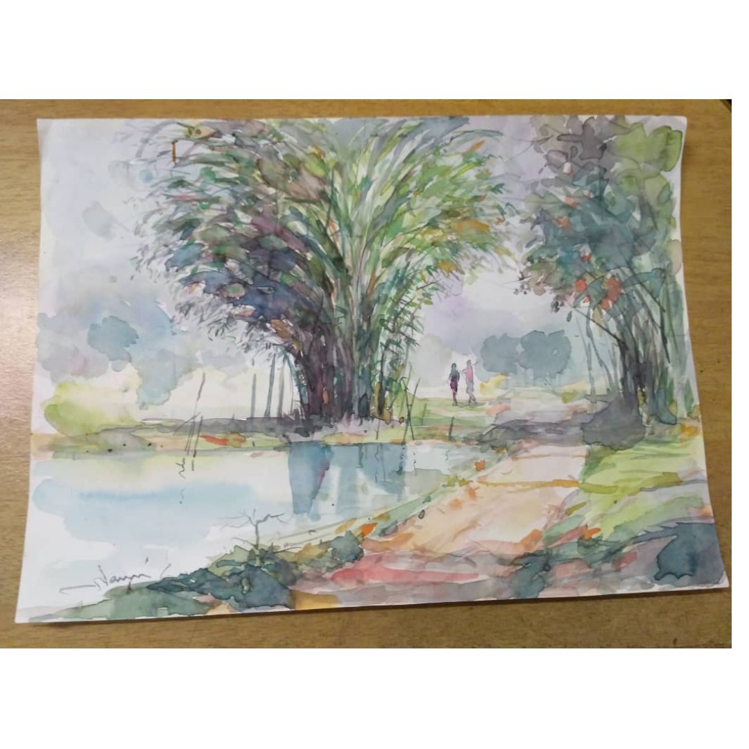 Malaysia Kelantan Village View Original Hand Drawing Watercolor Painting Nawi Sign Lukisan Cat Air Kampung