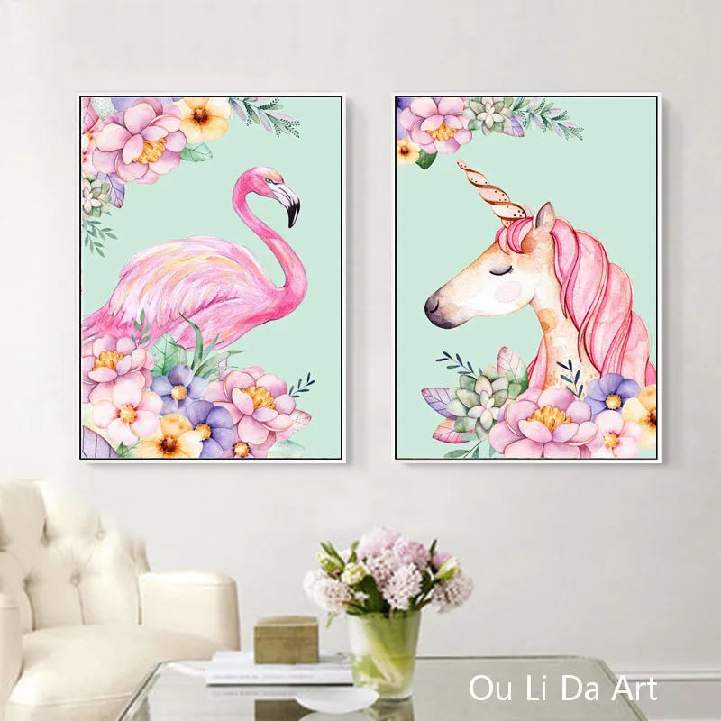 Us 4 71 41 Off Tidak Ada Bingkai Kartun Pink Unicorn Flamingos Cetakan Kanvas Lukisan Minyak Dicetak Pada Kanvas Kid Room Wall Art Dekorasi
