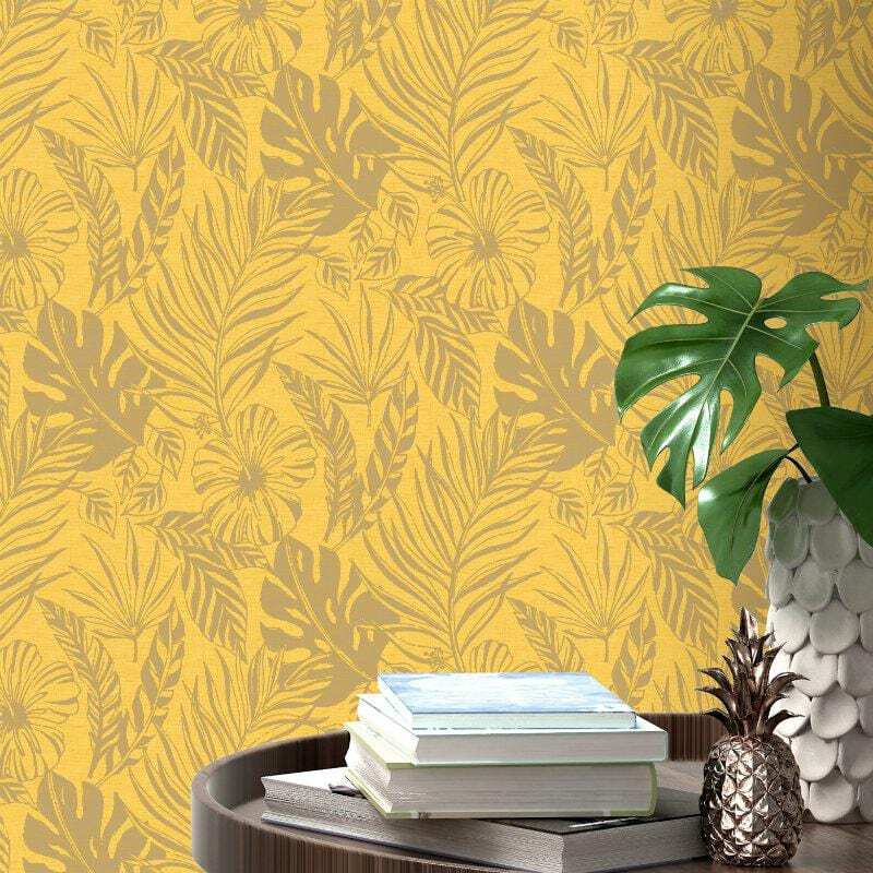 Details About Yellow And Gold Tropical Leaf Wallpaper Portfolio By Rasch 215526